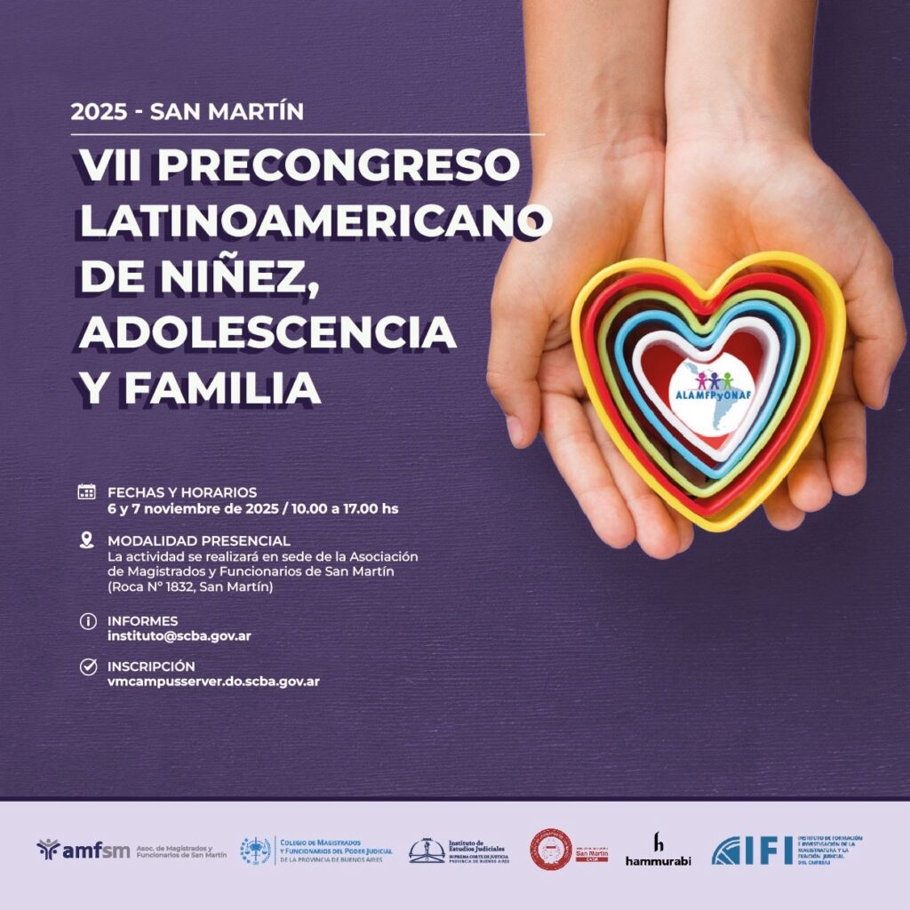 Llega a San Martín el VII Precongreso Latinoamericano de Niñez, Adolescencia y Familia. 6 y 7/11, 10 a 17 hs, modalidad presencial. Inscripción online: vmcampusserver.do.scba.gov.ar · Consultas: instituto@scba.gov.ar.